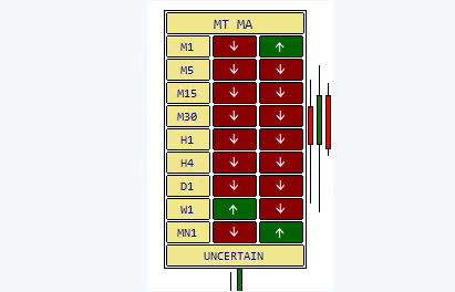 指标提供了一个简单的表格,让您可以看到每个时间周期中的价格是高于还是低于移动平均线。您还可以在图表上看到移动平均线目前在所有周期中是朝上还是朝下。